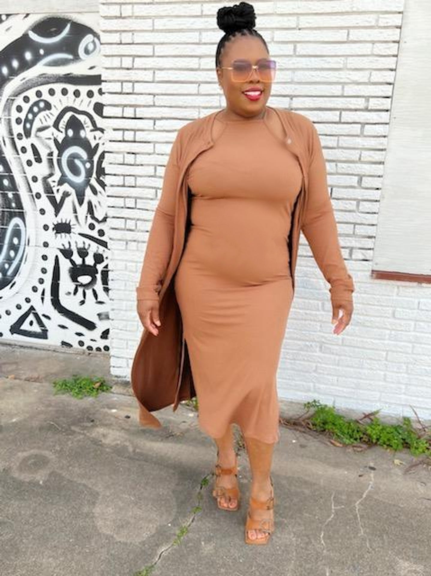 Sleeveless long tube dress with long sleeve and length cardigan. Dress runs big and has a lot of stretch. Model is wearing a X-Large.